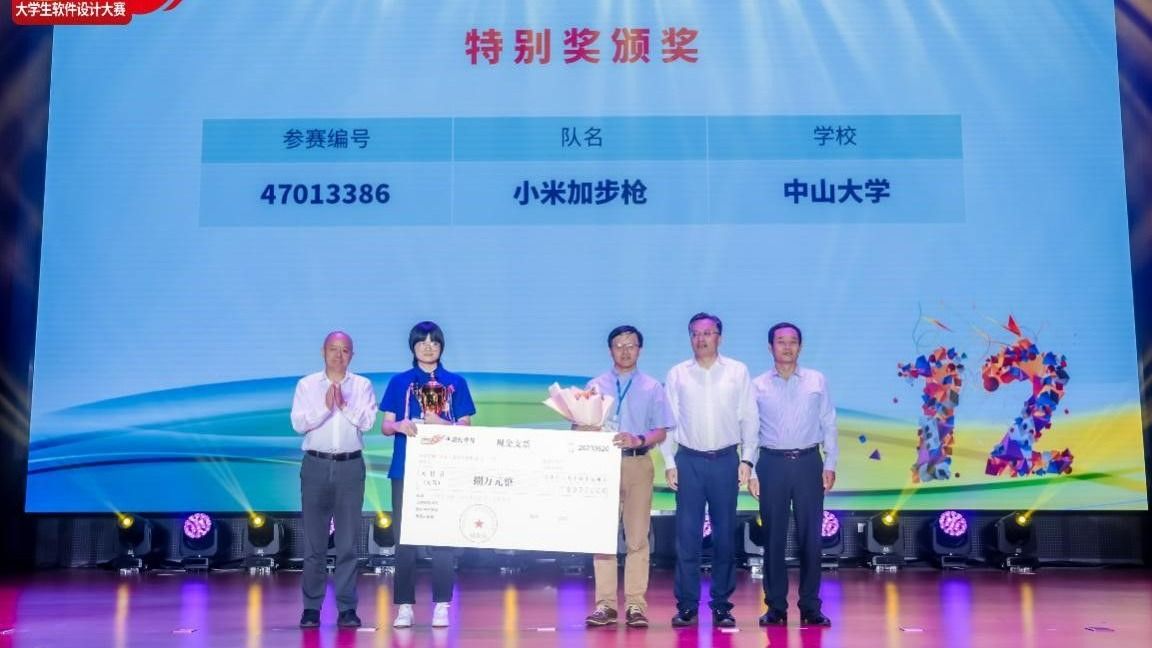 中大新聞網訊(通訊員孫興華)近日,第十二屆“中國軟件杯”大學生軟件設計大賽總決賽在南京落下帷幕。中山大學電子與通信工程學院2021級碩士生房若宸一人組隊“小米加步槍”, 在指導教師孫興華副教授悉心指導下,經過多輪緊張激烈的比拼, 榮獲本屆大賽的最高獎項——一等獎特別獎,獎勵金8萬元。這是我校在“中國軟件杯”大賽歷史上取得的最好成績,首次捧得代表最高榮譽的“中國軟件杯”。