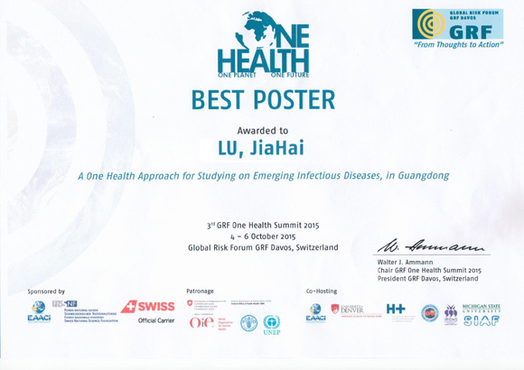 The 3rd Global Risk Forum (GRF) One Health Summit was held on 4-6 October 2015 in Davos, Switzerland. Prof. Jiahhai Lu from School of Public Health, Sun Yat-sen University attended this conference as the only Chinese representative. His poster, entitled “A One Health Approach for Studying on Emerging Infectious Diseases in Guangdong” was awarded the Best Poster Prize.