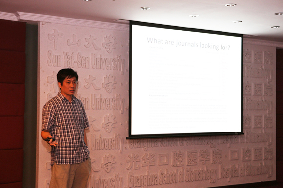 Prof. Alex Fok, Director of Minnesota Dental Research Center for Biomaterials and Biomechanics of University of Minnesota, giving a lecture in Hospital of Stomatology of Sun Yat-sen University