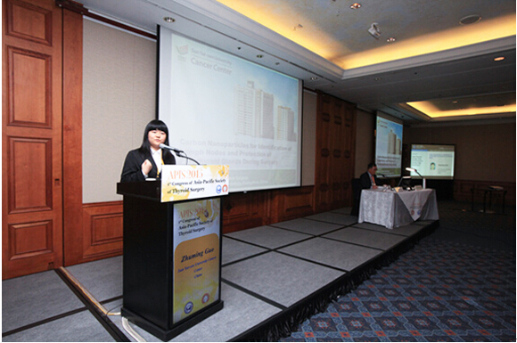 Dr. Li Yin, representing Professor Guo Zhuming, gave a presentation titled “Carbon Nanoparticles (CNs) for Identification of Lymph Nodes and Protection of Parathyroid Glands During Surgery”. Since the incidence of Differentiated Thyroid Cancer has been increasing continuously worldwide, effective methods to remove additional metastatic LN while retaining the parathyroids are needed. Dr. Li Yin and Professor Guo Zhuming found that the use of CNs resulted in an average of 2.71 more retrieved lymph nodes removed per patient case, lowered the rate of accidental parathyroid removal by approximately 23%, lowered the rate of postoperative transient hypoparathyroidism by approximately 21%, and lowered the rate of postoperative transient hypocalcemia by approximately 38% as well. CNs method may partially improve the extent and accuracy of neck dissection and preserve the normal anatomical structure and physiological function of the parathyroid glands during thyroid cancer surgery. This speech was positively responded and discussed by the attendees at the meeting.
