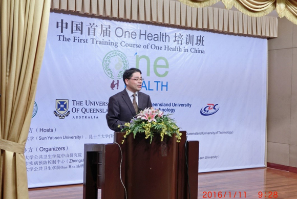 In order to promote One Health development in China, the first 5-day training course of One Health was held in Zhongshan city, Guangdong province, the hometown of Dr. Sun Yat-sen, on 11th January, 2016. This training was organized jointly by Sun Yat-sen University (SYSU), University of Queensland (UQ), and Queensland University of Technology (QUT), and undertaken by One Health Research Center of School of Public Health, SYSU and Zhongshan Center for Disease Control and Prevention (Zhongshan Research Institute of School of Public Health, SYSU).