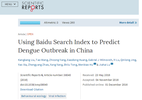 Using Baidu Search Index to Predict Dengue Outbreak in China”. The research is based on internet big data of network monitoring system, using Baidu search index to evaluate effectiveness of control measures and predict outbreak of Dengue Fever.
