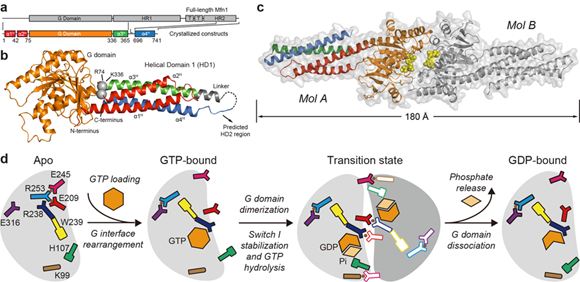 Figure 1: MFN1 mediated mitochondrial tethering. a, Construct design for crystallization. b, Overall structure of engineered MFN1. c, Dimerization of GTPase domain in the transition state of GTP hydrolysis. d, Conformational rearrangements of MFN1 in the GTP turnover cycle.