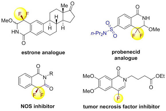 By using 2,2-difluorovinyl tosylate as a novel coupling partner, the reaction of N-OMe benzamide under the catalysis of Rh(III) delivered a monofluorinated alkene, which was treated with acid to give the 4-fluoroisoquinolin-1(2H)-one product in one-pot. With N-OPiv benzamide as substrate, the direct formal [4+2] cyclization occurred to provide the gem-difluorinated dihydroisoquinolin-1(2H)-one in good efficiency.Systematic mechanistic studies by using experimental and theoretical methods were conducted and a new coplanar b-F elimination mechanism was proposed. The synthetic utility of the reaction was evidenced by the successful elaboration of two drugs (estrone and probenecid) and rapid assembly of two bio-active compounds (NOS inhibitor and tumor necrosis factor inhibitor), demonstrating its application potential in the field of drug discovery.