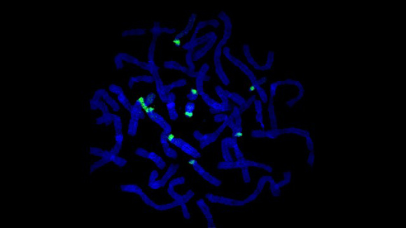 Human chromosomes are stained blue (DAPI) with ribosomal DNA in green (FISH probe);