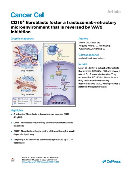 Fibroblasts are the most abundant stroma cells in the tumor microenvironment and are important participants in tumor progression. Functional heterogeneity of fibroblasts is increasingly recognized, as accumulating evidence has revealed that carcinoma-associated fibroblasts (CAFs) can exert either pro- or anti- tumor effects. Others and we have identified several CAF subsets with distinct phenotypes and functions by specific markers. For example, CD10+GPR77+ fibroblasts, which are driven by complement signaling, induce chemoresistance by fostering a supporting niche for cancer stem cells. Recently, the research team directed by Prof. Shicheng Su from Sun Yat-sen Memorial Hospital, Sun Yat-sen University, revealed a new mechanism of the pro-tumor effect mediated by Fcγ receptor signals in non-leukocyte cells. This work entitled "CD16+ Fibroblasts Foster a Trastuzumab-Refractory Microenvironment That is Reversed by VAV2 Inhibition" was published online in Cancer Cell on Nov. 14th. Prof. Shicheng Su from Sun Yat-sen Memorial Hospital, Sun Yat-sen University is the corresponding authors. Xinwei Liu, Yiwen Lu, Jingying Huang and Yue Xing are co-first authors.