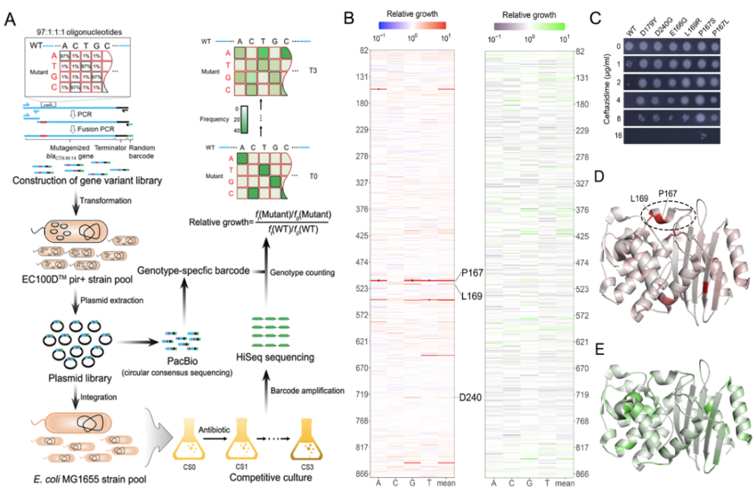 The experimental part of the study consists of four major steps. First, doped oligonucleotide was synthesized with a mutation rate of 3% per site, which was then concatenated with the remaining wild-type regions via multiple rounds of fusion PCR to generate the mutant library. During this process, a random 20 bp barcode was also attached as an index of the genotypes. Second, the blaCTX-M mutant library was bulk-transformed and integrated into the attHK022 site of E. coli MG1655 as a single copy. Third, the correspondence between blaCTX-M genotype and the 20bp barcode was determined by PacBio-CCS sequencing. Fourth, pooled competitive growth of all the mutants was followed by regular high throughput sequencing of the barcodes to determine the relative growth of the mutants in the presence of antibiotics (i.e., the antibiotic resistance). Supporting the validity of this method, mutations that are proximal to the active center of CTX-M, such as P167, L169, E166, are associated with significantly greater changes in relative growth, which is also in agreement with individually measured MICs (Figure 1).
