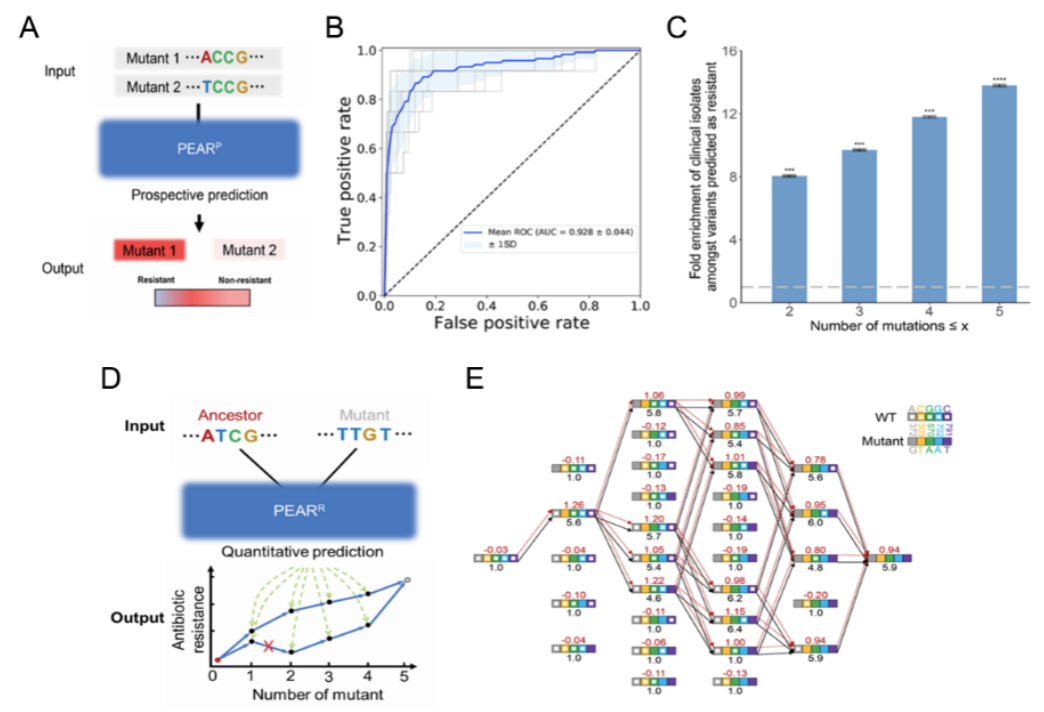 Based on the experimental data, the research team constructed two neural network models for prospective (PEARP) and retrospective (PEARR) prediction of CTX-M's evolution. Here, PEARP is able to predict whether a new mutant is resistant, with an AUC of 0.928. There was a significant enrichment among clinical isolates of the resistant genotypes predicted by PEARP (including single-, double-, triple-, and quadruple-mutated genotypes), suggesting that the prediction of PEARP has clinical relevance. The PEARR can be used to retrospectively predict the evolutionary trajectory of CTX-M, which appeared to be highly consistent with the trajectories revealed by independent drug susceptibility experiments under the SSWM (Strong-Selection-Weak-Mutation) model (Figure 2).