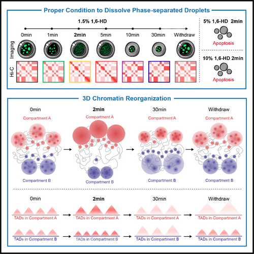 Genome Biology. For the first time, the using condition of 1,6-HD (1.5%, 2 min) with fewer side effects was optimized and tested on a variety of cell lines, and a time-resolved map of 3D chromatin structure upon1,6-HD treatment was provided to explore the relationship between phase separation and 3D chromatin organization.