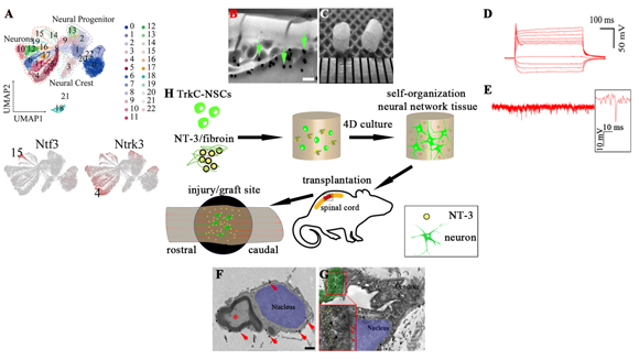 in vitro to construct neural network tissue similar to embryonic spinal cord. Recently, Professor Zeng Yuan-shan’s team of Sun Yat-sen University revealed that neurotrophin-3 (NT-3), a key molecule, was screened based on the bioinformatics of embryonic spinal cord development and the neural stem cells (NSCs) expressing NT-3 receptor (tyrosine kinase receptor C, TrkC) were induced to self-organize into a neural network tissue in three-dimensional (3D) scaffold materials by using NT-3 controlled release technique. The tissue-engineered neural network tissue can integrate functionally with the host spinal neural circuit after transplantation into rat spinal cord injury with complete transection. This therapeutic strategy provides a novel idea for the construction of a microenvironment optimized NSC-derived tissue engineering neural network tissue for repairing central nerve injury.