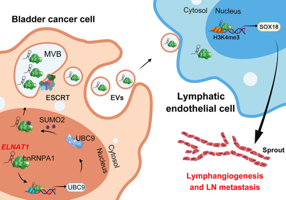 In the present study, Prof. Tianxin Lin’s team identified a novel lncRNA ELNAT1, which was significantly overexpressed in BCa cell-secreted EVs and correlated with the lymphatic metastasis of BCa. Mechanistically, ELNAT1 induced UBC9 overexpression to catalyze the SUMOylation of hnRNPA1 at lysine-113 residue, which mediated the recognition of ELNAT1 by endosomal sorting complex required for transport (ESCRT) and facilitated their packaging into EVs. EV-mediated ELNAT1 was specifically transmitted into HLECs and epigenetically activated SOX18 transcription to enhance lymphangiogenesis and lymphatic metastasis of BCa. These findings highlight a novel mechanism that EV-mediated ELNAT1 promotes the lymphangiogenesis and LN metastasis of BCa in a SUMOylation-dependent manner, and implicate ELNAT1 as an attractive therapeutic target for LN metastatic BCa.