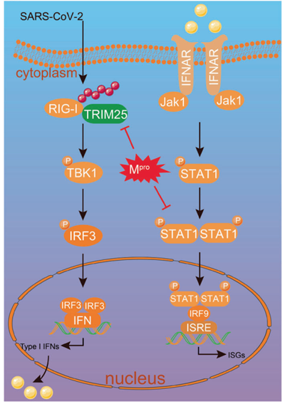 Although IFNβ pre-treatment was showed to effectively reduce the replication of SARS-CoV-2, SARS-CoV-2-induced IFNβ signaling was relatively low compared with other viruses, suggesting that SARS-CoV-2 could inhibit type I IFN production. In this study, researchers revealed the dual functions of SARS-CoV-2 Mpro in impairing virus-triggered type I IFN production and the induction of downstream ISGs. On one hand, Mpro can target RIG-I, the major viral RNA sensor in the cytosol, and inhibit the IFN induction by inhibiting the K63-linked ubiquitination of RIG-I. On the other hand, SARS-CoV-2 Mpro could also reduce the release of IFN-induced downstream antiviral cytokines by restricting IFN transduction signaling. SARS-CoV-2 Mpro could promote the autophagic degradation of key transcription factors STAT1, thus inhibiting nuclear translocation of STAT1 and restricting IFN transduction signaling.