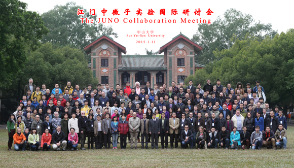 On January 10-14, 2015, the JUNO Collaboration Meeting, sponsored by Sun Yat-sen University (SYSU), and co-organized by the School of Physics and Engineering (SPE) and the SYSU-IHEP Joint Institute of High Energy Physics (SHEP) at SYSU, was held on South Campus of SYSU. More than 300 scientists from Austria, Armenia, Brazil, Chile, China, Czech, France, Finland, Germany, Italy, Russia and the US joined the meeting. Chinese collaborators consist of Sun Yat-sen University, Guangxi University, Wuhan University, Peking University, Tsinghua University, Nanjing University, Xiamen University, Shanghai Jiao Tong University, Chongqing University, East China University of Science and Technology, University of Chinese Academy of Sciences, Institute of High Energy Physics (IHEP), China Institute of Atomic Energy, and etc. Meanwhile, the industry partners such as HZC Photonics and North Night Vision Co., Ltd took part in the collaboration meeting. Prof. Baojun LI, Dean of SPE & SHEP, gave a speech to welcome all participants.