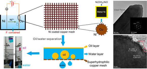 3. Decorate Cu mesh with superhydrophilic core-shell Ni nanoparticles for oil/water separation. In the previous reports, (001) crystal facet exposure of TiO2, which was mainly due to the existence of fluorine, had been demonstrated. Therefore, fluorine may be the key factor to form nanoparticles with exposed lattice plane. Herein, they synthesized a superhydrophilic copper mesh decorated with Ni-NPs via simple electrodeposition in fluorine-containing electrolyte; the polygonal Ni-NP consists of a metal Ni core and a NiO/Ni(OH)2 shell, which is mainly due the crystal facet exposure of Ni-NP. This multicomponent mesh shows remarkable underwater ultralow adhesive superoleophobicity as well as excellent oil/water separation performance. After optimizing the factors (electrodeposition time and applied voltage) of preparation, the oil content in separated water is lower than 3 ppm. The stability and the properties for repeated use of superhydrophilic Cu mesh are also excellent. It is the extension of fluorine-induced superhydrophilicity. This work has been published at