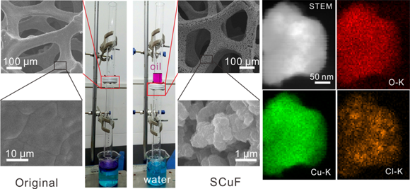 2. Sythesize, for the first time, the oxy-chloridized superhydrophilic Cu foam for oil/water separation. On the basis of the Fluorine-induced superhydrophilicity (FIS), they synthesized superhydrophilic Cu foam (SCuF) composed of oxy-chloridized hierarchical nanoparticles with metal Cu core and Cu2O/CuO1-x/2Clx shell via the combination of anodization, HCl etching and calcination, in which the Cl-terminated groups were formed at the surface of Cu-NPs in the form of -O-Cu-Cl or even -Cu-Cl. This SCuF shows ultrahigh water permeability and remarkable oil/water separation performance (separation efficiency > 99%). Moreover, the properties of SCuF for repeated use, anti-corrosion and anti-scratch are also excellent. This SCuF has great potential in industrial applications. This work has been published at