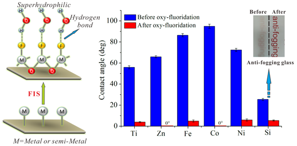 1. A new route for surface modification: Fluorine-induced superhydrophilicity. On the basis of the Fluorine-induced superhydrophilicity (FIS) originating from the bottom of TiO2 nanotube arrays, they have provided a novel approach to produce superhydrophilic materials and have demonstrated the FIS method via combining both experiment and theoretical computation. Simulation results showed that hydrogen bonds are formed between water molecules and oxy-fluoridized (semi)metallic interfaces. The value of this FIS has been demonstrated through the successful surface treatment for Ti, Zn, Fe, Co, Ni, and Si.