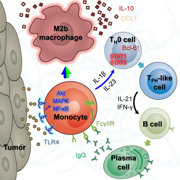 FH-like cells operated in IL-21–IFN-γ-dependent pathways to foster plasma cell differentiation and thereby induced protumorigenic M2b macrophage polarization via IgG/FcγII receptor signals. These results are among the first that demonstrated the existence, regulation, and physiological functions of IL-21