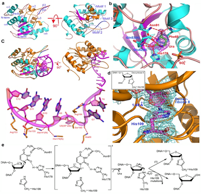 MsmUdgX first removed the target uracil and the conserved residue His109 immediately forms a covalent linkage with the apyrimidinic site of the ribose in single-stranded DNA. However, the enzyme also loses its intrinsic uracil-excision activity due to the fact that it would not regenerate. This study solved five crystal structures of