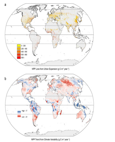 The terrestrial biosphere frequently acts as a carbon sink in the global carbon cycle. However, it may release a large amount of carbon dioxide and become a carbon source owing to some disturbances including droughts, urban expansion and other factors. As a crucial indicator of terrestrial ecosystems, terrestrial NPP reflects not only the production capability of vegetation but also the ecological processes directly (e.g., carbon source/sink). It is still uncertain what is the spatiotemporal details of terrestrial NPP change and their mechanisms. Many studies analyzed the responses of terrestrial NPP to urban land expansion and climate driving factors, respectively. Despite it, limited attempts addressed on their coupled impacts of the two factors on terrestrial NPP change, especially at the global scale. To solve this problem, Prof. Xiaoping Liu and his collaborators analyzed the spatiotemporal changes of global urban lands between 2000 and 2010 using a 30-m global land use dataset (i.e., GlobeLand30). In addition, terrestrial NPP was evaluated by combining MODIS NPP products (MOD17A3), the CASA model and the LPJ hydrology model. The relative contribution of global urban expansion and climate variability on terrestrial NPP were then discussed. It is found that global urban land expansion in past decade led to a decrease in terrestrial NPP (22.4 TgC year-1), which offset 30% of the NPP increase that caused by climate variability. The findings are of great significance to understand the complex mechanism of global terrestrial NPP changes.