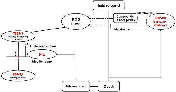 NlPrx and thus increases resistant individuals’ ability to clear the cost-incurring ROS of any source (Figure 1). This represents the first functional characterization of such fitness costs-overcoming modifier genes/alleles of insecticide resistance. This pioneer study may prompt a study shift from focusing on Stage one to both stages of resistance evolution of pests to insecticides.