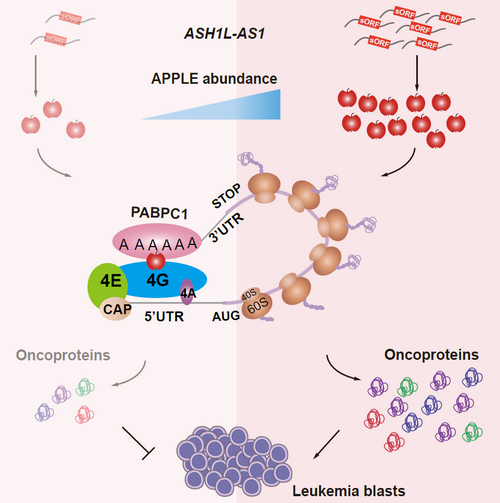 Recently, Prof. Yue-Qin Chen’s group has made a new progress in uncovering the micropeptide-coding potential of long “non-coding” RNAs (lncRNAs). They identified a set of micropeptides embedded in small open reading frames (sORFs) of lncRNAs by applying multiomics approaches including ribo-seq, mass spectrometry and RNA-seq. Subsequent functional screening further illustrated that these micropetides regulated the uncontrolled proliferation of malignant cells. Interestingly, APPLE, a peptide located in endoplasmic reticulum (ER), is essential for the rapid translation of specific oncogenic proteins in malignant cells. Mechanical investigations demonstrated that APPLE is a novel regulator of the rate-limiting translation initiation step, in which it functions as a “rivet” to enhance the PABPC1-eIF4G interaction. In this way, APPLE facilitates mRNA circularization and eIF4F initiation complex assembly to support a specific pro-cancer translation program and accelerates the malignant transformation of cells.