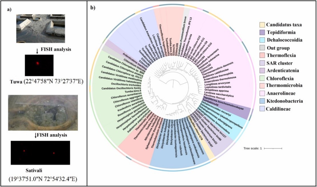 Figure 1 a) geographic location of the hot springs where the samples were collected and FISH analysis showing the precence of Chloroflexota. b), phylogenomics tree reconstruction based on 16 marker genes showing the position of MAGs.