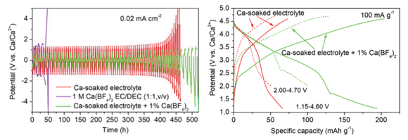Figure 1. Ca-metal batteries based on electrolyte optimization strategy and graphitic fibric carbon membrane cathode.