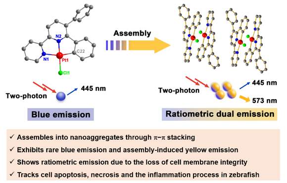 Angewandte Chemie International Edition (IF = 12.959) entitled "Supramolecular Assembly of An Organoplatinum(II) Complex with Ratiometric Dual Emission for Two-Photon Bioimaging". The first author is Dr. Cheng Ouyang, School of Chemistry, Sun Yat-sen University. Associate Professor Yu Chen (Sun Yat-sen University), Dr. Xiting Zhang (University of Hong Kong), and Professor Hui Chao (Sun Yat-sen University) are the co-corresponding authors.