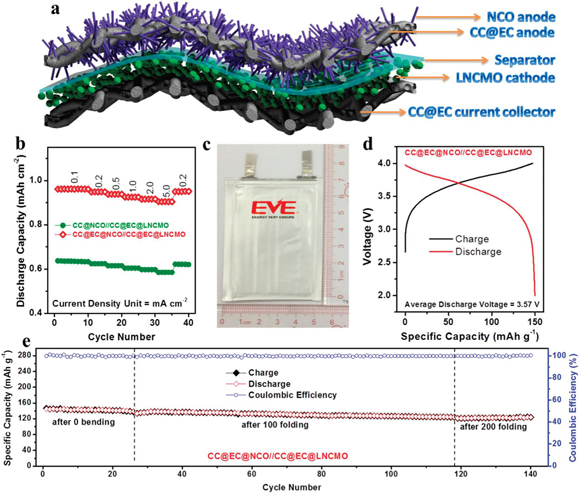Properties of the flexible lithium ion battery. (a) Schematic representation of the flexible device. (b) Rate performance of AFLIBs based on CC@NCO and CC@EC@NCO anodes and CC@EC@LNCMO cathode. (c) Optical image of the CC@EC@NCO//CC@EC@LNCMO FLIB. (d) Charge/discharge profile of the CC@EC@NCO//CC@EC@LNCMO AFLIB at applied current of 5 mA. (e) Cyclic performance of CC@EC@NCO//CC@EC@LNCMO AFLIB at different folding numbers.