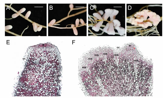 Nodulation phenotype of wild-type plants (A, B, E) and of the mutant deficient in MtNFH1 (C, D, F)