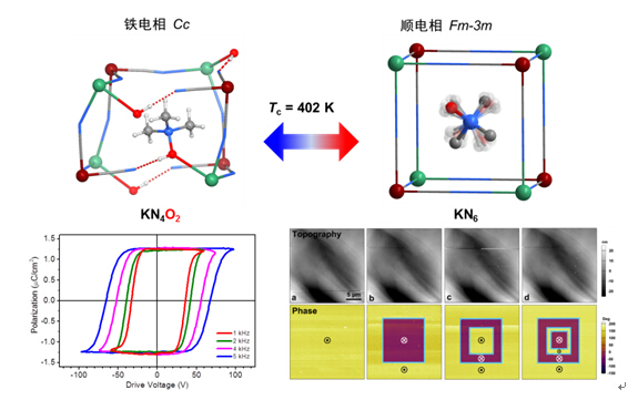 Ferroelectric materials, in which spontaneous electric polarizations can be reversed using an electric field, are widely used in a variety of technical applications, such as ferroelectric random access memory, mechanical actuators, and piezoelectric devices. Since the first ferroelectric was discovered in 1921, the underlying phase transitions of ferroelectric mechanisms were limited to order?disorder and displacive types that are not involved in breaking of the chemical bonds. The phase transition involving the cleavage and reformation of chemical bonds hence to cause a reorganization of the crystal structure, which generally requires applying high pressures in inorganic crystals, was scarce and has yet to be achieved for ferroelectric mechanism. The research work of Associate Professor Wei-Xiong Zhang and coworkers showed that the bond-switching transition under ambient pressure is designable in molecular crystals, and demonstrated how to utilize the weaker and switchable coordination bonds in a novel molecular perovskite, [(CH3)3NOH]2[KFe(CN)6], to afford a scarce multiaxial ferroelectrics with a high Curie temperature of 402 K and 24 equivalent ferroelectric directions (more than BaTiO3). Moreover, the high-quality thin films of this compound can be easily fabricated by a simple solution process, and to reveal perfect ferroelectric properties at both macroscopic and microscopic scales, suggesting this compound as a promising candidate for applications in next-generation flexible electronics.