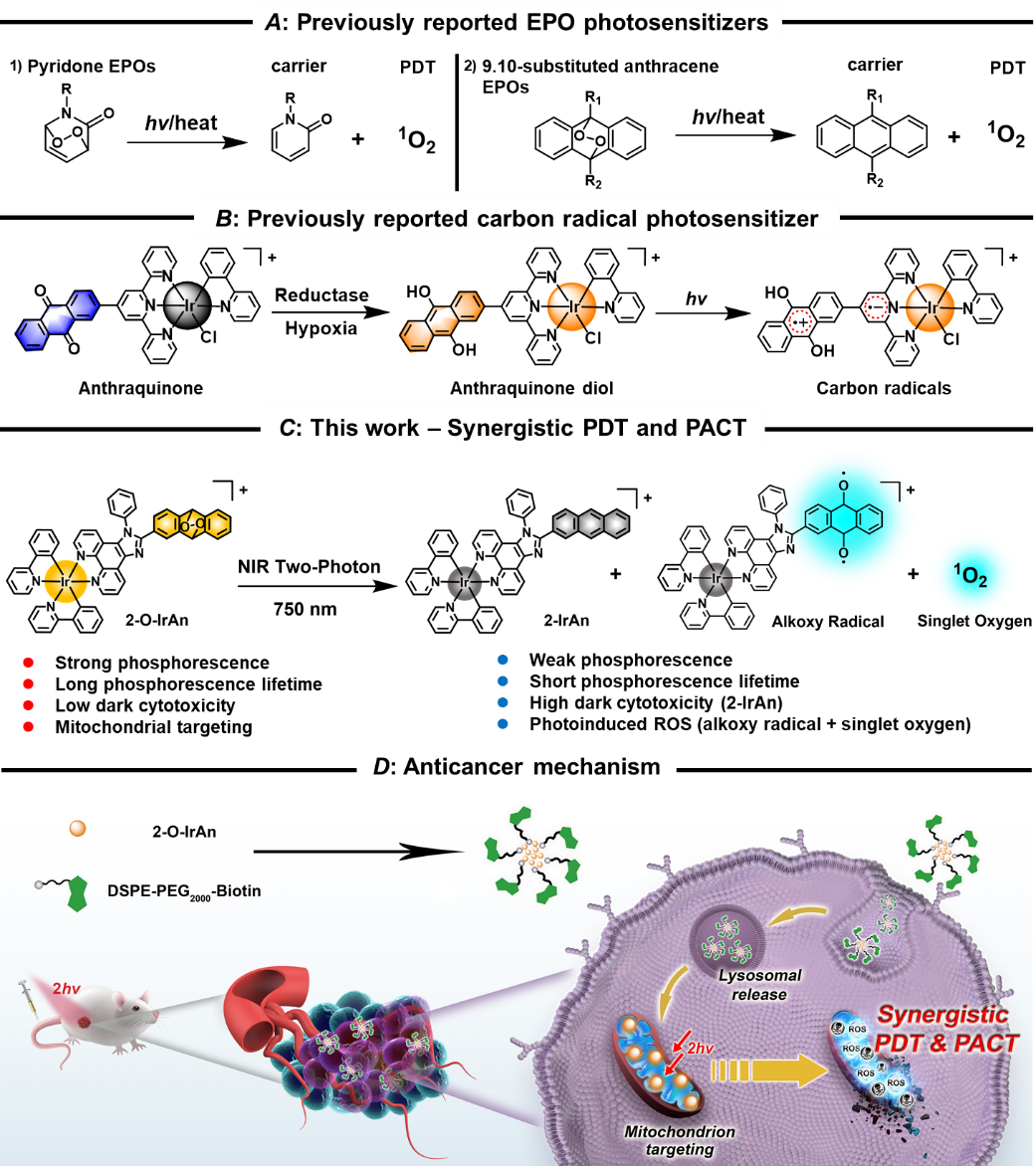 Recently, Prof. Hui Chao (School of Chemistry, Sun Yat-sen University) and Prof. Gilles Gasser (Chimie ParisTech, PSL University, France) reported on novel mitochondria-localized iridium(III) endoperoxide prodrug, which synergistically released upon two-photon light irradiation under hypoxic conditions, highly cytotoxic iridium(III) complex and singlet oxygen as well as generates an alkoxy radical. Due to its independence from oxygen concentration inside cancer cells and its multi-action mechanism, the compound was highly phototoxic in hypoxic tumor cells and 3D multicellular tumor spheroids in the nanomolar range. This study presents the first example of an iridium-based endoperoxide prodrug for synergistic photodynamic therapy/photoactivated chemotherapy under hypoxia. It presents one of the most efficient metal-based PDT PSs working under hypoxic conditions and that can be excited with 2P. Due to a mechanism of action of 2-O-IrAn prodrug involving three independent pathways (1) release of highly cytotoxic iridium(III) complex, (2) generation of singlet oxygen, and (3) generation of an alkoxy radical, extremely high phototoxicity was observed in cancerous cells under normoxic and hypoxic conditions (hypoxia: IC50=60.0 nM, PI=690; normoxia: 51.5 nM, PI=959.1), presenting a novel approach for synergistic photodynamic therapy and photoactivated chemotherapy. Encapsulation within a biotin functionalized polymer into DSPE-PEG-Biotin@2-O-IrAn nanoparticles provides high tumor accumulation and improves the pharmacological properties of the compound. While not showing any side effects within a mouse model, the nanoparticles were found to eradicate a tumor inside an animal model within a single procedure, presenting better therapeutic properties than the clinically approved anticancer drug cisplatin.