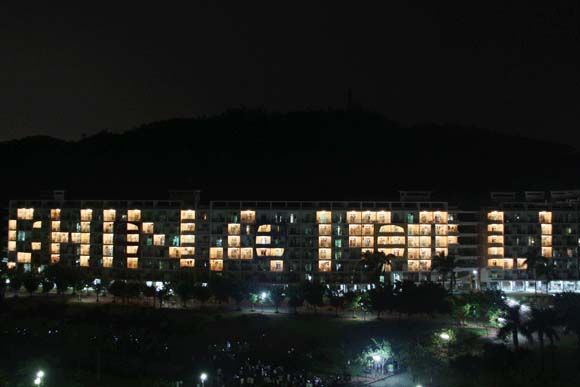 "Shinning Guangdong, Blessing Motherland” –the lightning ceremony at Zhuhai Campus of SYSU, one of the serial activities for Guangdong youth to celebrate the 60th anniversary of the founding of new China, co-organized by the provincial propaganda department, provincial committee of the Youth League and Southern Media Corporation (SMC), was held successfully at the No.5 and No.6 dormitories of Rongyuan on the evening of September 19th.