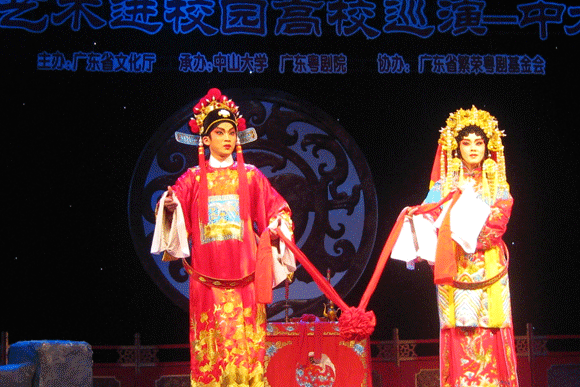 The veteran cadre of the opera actors from the Cantonese Opera Institute presented five classic episodes of the traditional Cantonese Opera highlights “Zhong Kui Shang Lu”, "Di Nvhua Xiang Yao”, "Tou Jiang”, "Huo Zhuo Zhang Sanlang”, "Da Nao Shizi Lou”, featuring four traditional opera characters—Sheng, Dan, Jing, Chou, and including the civil and martial episodes and the techniques of “Chang Nian Zuo Da”. The episode “Tou Jiang” performed by the first-rate actor Zeng Xiaomin conveyed sensitive emotions and variegated facial expressions. With the episode unfolding, the actor threw up the two-meter long water sleeves to express the character’s anger, presenting the performing technique of throwing up sleeves to the audience. In the episode of “Da Nao Shizilou”, Wu Song fought with Xi Menqing, standing up on the four legs of the upside-down desk, and sometimes cross-legged on them, wining the applause from the audience with his stunts.