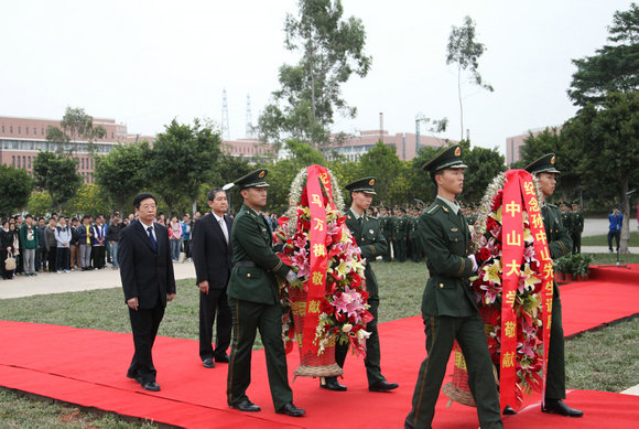Amidst the solemn music performed by the Armed Police Corps of Guangdong Province, the flag team of national defense students escorted the national flag and the university flag in and held a solemn flag-raising ceremony. Executive Vice President Xu Jiarui and Mr. Ma Iao Hang presented flower baskets on behalf of Sun Yat-sen University and Mr. Ma Man Kei respectively. All faculty members and students bowed to pay their respects.