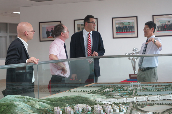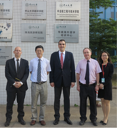 On April 29, 2015, Mr. Bertrand Furno, Consul General of France in Guangzhou, visited the Sino-French Institute of Nuclear Engineering and Technology (IFCEN) at Sun Yat-sen University. Prof. WANG Biao, Chinese Dean of IFCEN, Mr. Jean-Marie Bourgeois-Demersay, French Dean of IFCEN, and Ms. YU Zhantao, Deputy Dean of IFCEN, warmly welcomed Mr. Furno and his colleague, showed them around Zhuhai Campus, as well as the teaching facilities and research laboratories of IFCEN. During the visit, Prof. WANG and Mr. Bourgeois-Demersay introduced the training mode and laboratory platforms of the institution which, according to Mr. Furno, had impressed him very much.