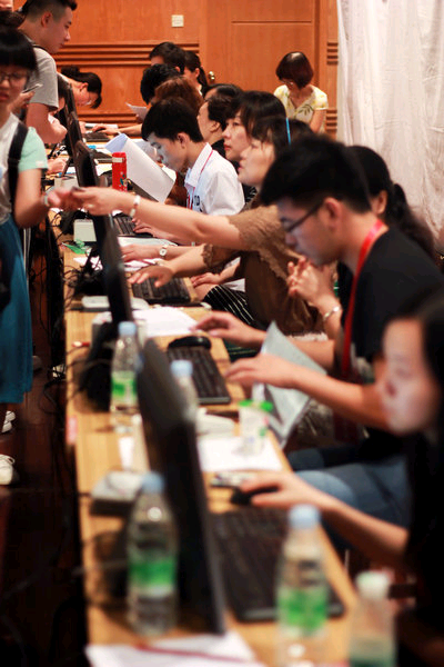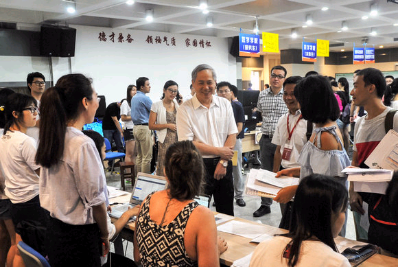 President Luo Jun visiting new students and staff members at the registration site (photo by Liu Jia)