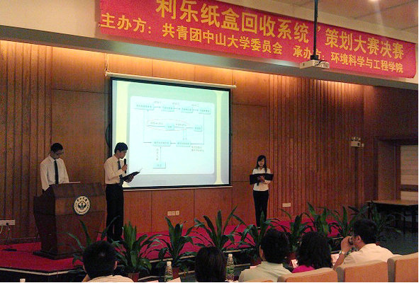 On the afternoon of Apr.23rd, the final of 2011 SYSU Science and Art Festival: Design Competition for “Recycling System of Tetra Pak Packages”, which was held by the university Youth League Committee and organized by the School of Environmental Science and Engineering (SESE), was successfully held in East Campus. The competition was officially launched at the end of December, 2011. 16 participating teams in final were selected from overall 56 teams signed in for the contest from the whole university. The judges of the final consisted of people from Tetra Pak China, volunteer group of “Green Family”, SESE, the Office of Student Affairs and the Propaganda Department of Party Committee.