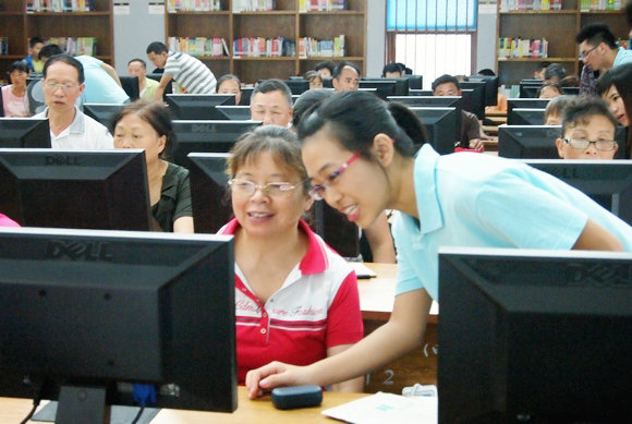 Volunteers offering information literacy training to senior citizens at Beichuan Library