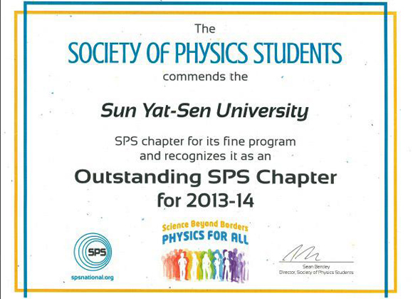 Recently, the Society of Physics Students (SPS) in the United States announced the winners of the 2014 Outstanding Chapter Award. Sun Yat-sen University SPS Chapter (SPS-SYSU Chapter) has been recognized as an Outstanding SPS Chapter for 2013-2014. Sun Yat-sen University is the second university in China to join the SPS. Established in 2012, SPS-SYSU Chapter won the 2013 Distinguished SPS Chapter Award.