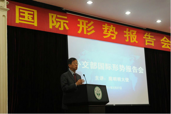 In order to strength university students’ ability to fully understand the international situation, to attract and inspire more outstanding graduates to dedicate themselves to diplomatic careers, the former Ambassador to the Kingdom of Sweden Chen Mingming, Vice Director of Office of Assessment and Recruitment of Cadre Department Ma Yongchao and the group held a series activity of tests and recruitment on South Campus of Sun Yat-sen University on May 27th,2011. The Assistant Secretary of Sun Yat-sen University Zhu Kongjun and Vice President Yan Guangmei warmly welcomed Ambassador Chen Mingming and the group to the university.