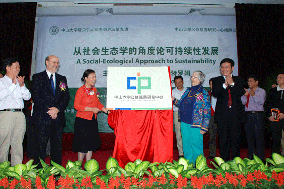 On May 6th, the winner of the 2009 Nobel Memorial Prize in Economic Sciences, Professor Elinor Ostrom from US Indiana University, at the invitation of State Administration of Foreign Experts Affairs, gave a lecture as one of the lecture series given by Nobel Prize Winners. At the meantime, she specially unveiled the plaque for the newly founded Charities Research Centre of SYSU. On the unveiling ceremony, she joyfully accepted the offered appointment as the honorary chairman of the Academic Consultation Committee of the centre.
