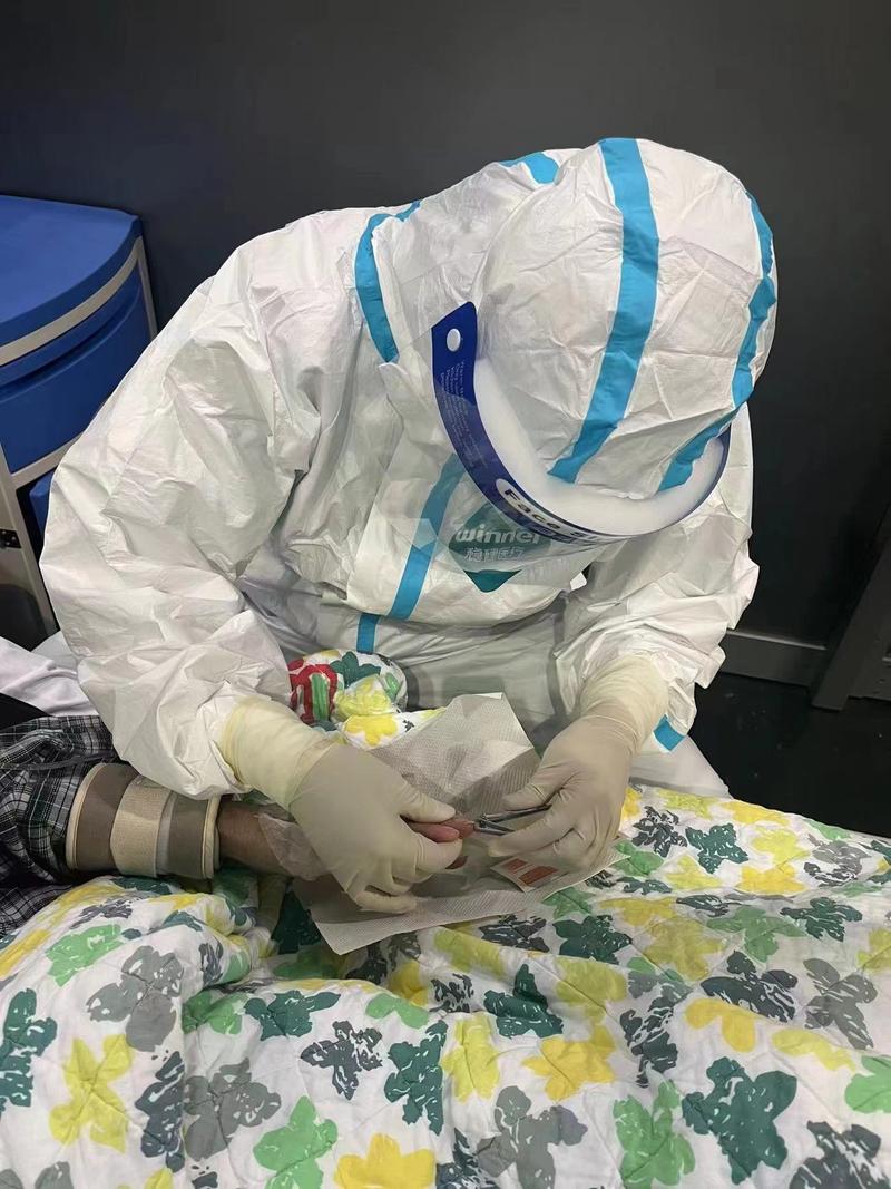 Xiao Yunfei, a nurse at the department of infectious disease at the Third Affiliated Hospital of Sun Yat-sen University, cuts nails for the patient at the community treatment facility at AsiaWorld-Expo on March 27, 2022. (PROVIDED COURTESY OF ZHU XIANG)
