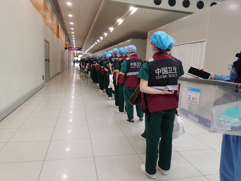 Members of the mainland medical support team queue up to enter the community treatment facility at AsiaWorld-Expo on March 21, 2022. (PROVIDED COURTESY OF ZHU XIANG)