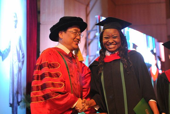 When He Jinghui, a M.A. student from Department of History, was shaking hands with the President, her graduation cap fell off. She picked it up in embarrassment. The President helped her put on the graduation cap.