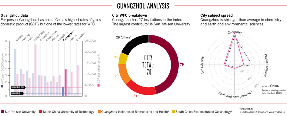SYSU is Guangzhou's leader. Last year it contributed to 158 articles, accounting for 47% of the city's WFC. Qinfen Zhang co-authored an article on the protein structure of a dengue virion in