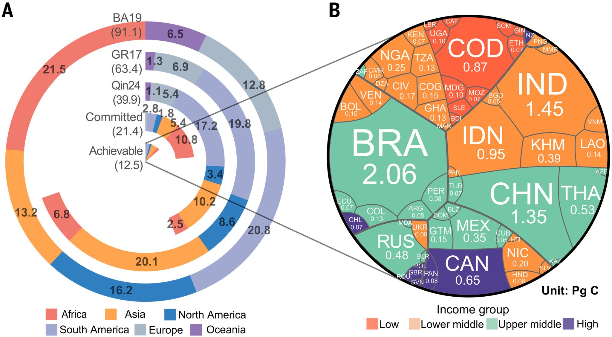 Estimated mitigation potential from forestation varies with land availability assumptions. (A) Global and regional ecosystem carbon sequestration. (B) The currently achievable mitigation potential varies among countries and income groups.