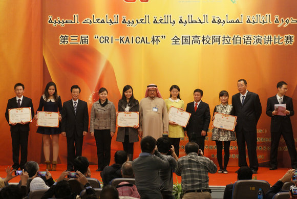 On November 22, the 3rd “CRI-KAICAL Cup” College Students Arabic Speech Contest, organized by China Radio International (CRI), came to an end in Beijing. Wen Guanghong, a student from the Department of Arabic of School of International Studies of Sun Yat-sen University, won the third prize. Mr. Zhai Jun, Vice Minister of Foreign Affairs, Mr. Ma Weigong, Deputy Editor-in-Chief of CRI, and diplomatic envoys of Arab states attended the ceremony and presented awards to the winners.